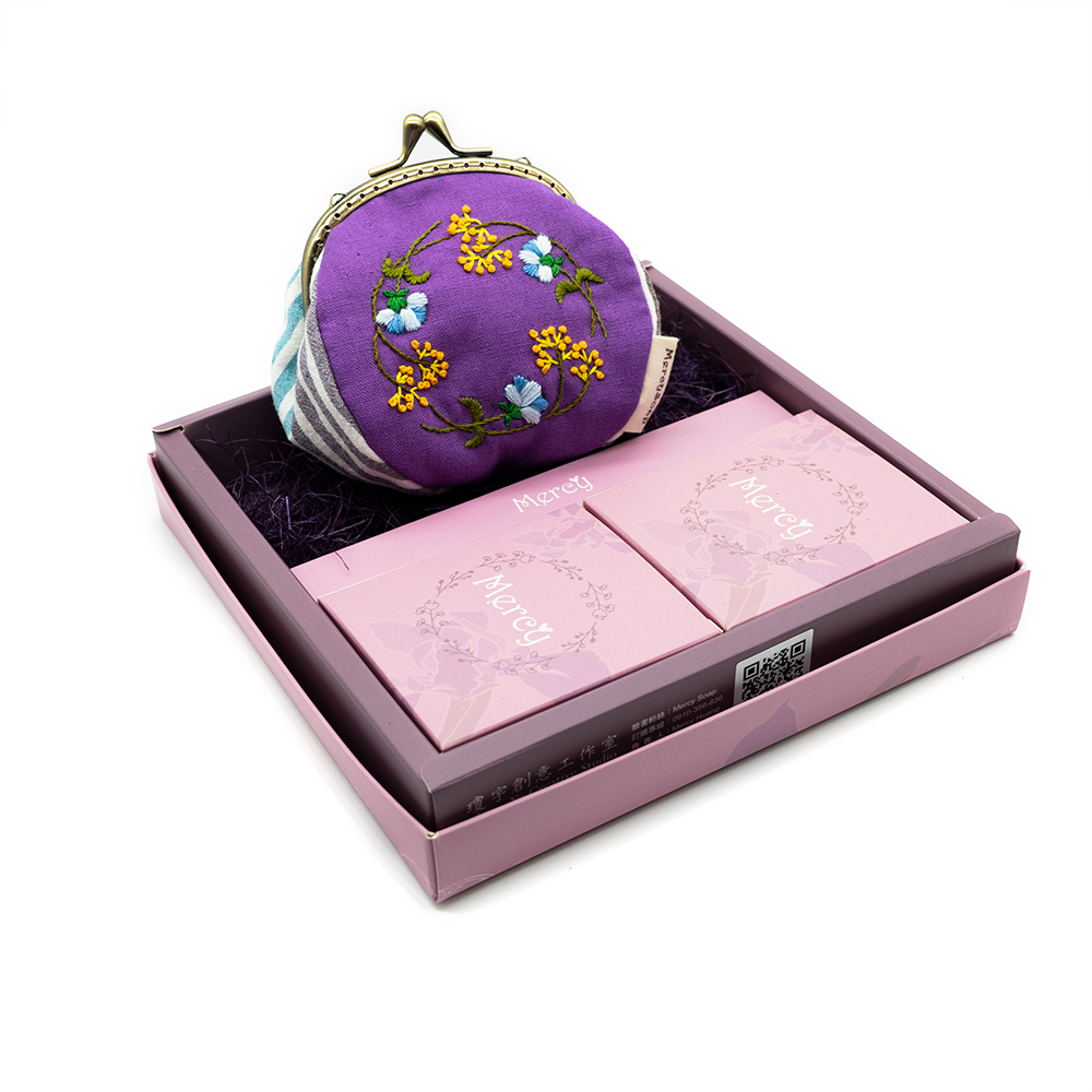(刺繡口金包x1、100±10克Mercy精油手工皂不挑款x2、品牌禮盒禮袋x1)