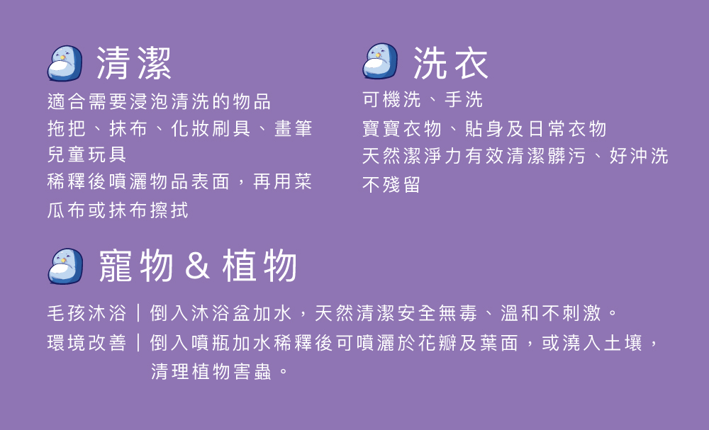 用途: 泡澡沐浴、清潔髒污、洗衣、寵物清潔及植物環境改善等多功能。